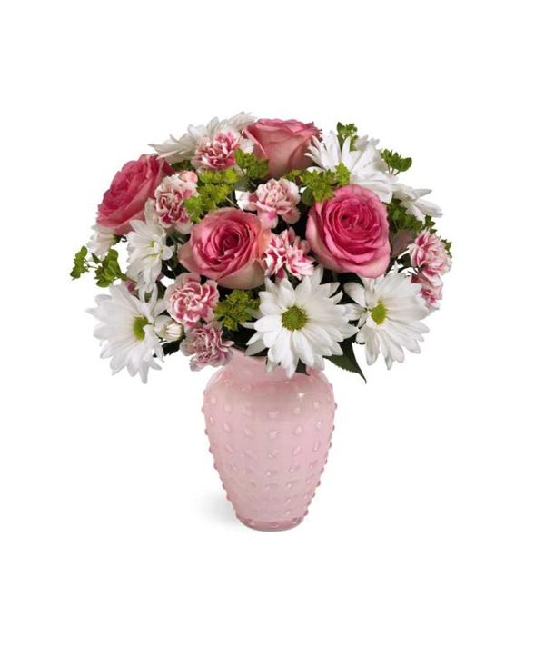 These white daisy poms have beautiful pink roses and bi-color pink mini carnations to help welcome this marvelous season. All are sweetly arranged in a pink glass hobnail vase.